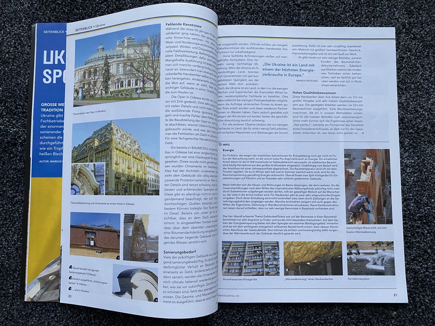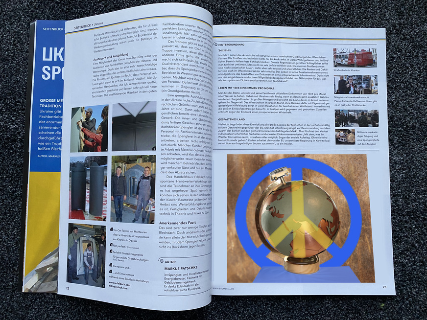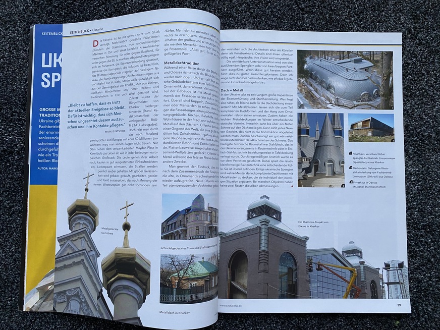 Von den eingangs erwähnten Fachberichten über hervorragende Metalldächer der Welt sticht ein Beitrag besonders hervor: der im Jahr 2014 erschienene Artikel „Ukraine, ein Spenglerparadies?“! Dieser Artikel ist aktueller denn je, weil er zeigt, was die Spenglerwelt zusammenhält. Weil er deutlich macht, wie elementar unsere Grundbedürfnisse sind. Und weil er uns vor Augen führt, wie sinnlos Zerstörung und damit verbundenes Elend sind. Übrigens überall auf der Welt!