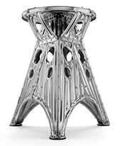 Im Januar 2017 entstand ein Beistelltisch aus Aluminiumwellblech mit Tischplatte aus Glattblech, der aktuell noch verbessert wird. Hier sind die statischen Eigenschaften der Wellprofile von besonderem Vorteil und durch das Bombieren wird die Konstruktion noch stabiler. Eine große Herausforderung war es, die engen Radien zu biegen, ohne Risse im Material zu riskieren. Um Radien von weniger als 90º zu erreichen, wurde das Material dreimal erhitzt und durch die Maschine gezogen. Die dafür verwendete Maschine hatten die findigen Designer von einer Breite von ursprünglich 1,50 m deutlich verkleinert und die ehemals glatten Walzen durch Profilwalzen ersetzt. Da die verarbeiteten Profile max. 40 cm breit sind, erfüllt diese Maschine ihren Zweck vollauf.
