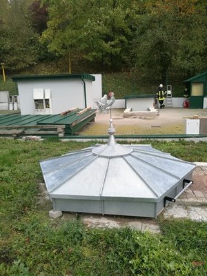Zum Glück erfolgt im BBZ Rohr auch die überbetriebliche Lehrunterweisung der Klempnerauszubildenden! Denn diese Pavillonabdeckung in Winkelstefalztechnik haben Azubis des 1.Lehrjahres in einem einwöchigen Projekt gefertigt. Auch die Treibarbeiten am Hahn und den Kugeln haben sie unter Anleitung selbst ausgeführt!