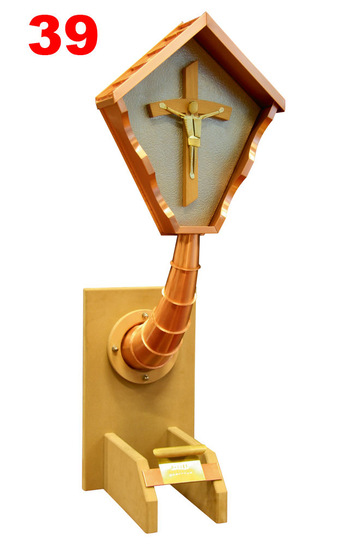 10.11.2009 | Druckvorschau WegkreuzSchindelgedecktes Dach auf gegliedertem HalterMaterial: Kupfer, Messing, EdelstahlVerbindung: FalztechnikKünstlerisch gesaltete Figur an Holzkreuz vor strukturierter Edelstahlplatte