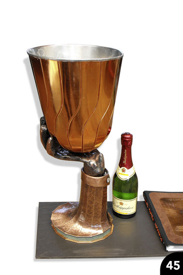 Pokal Der Pokal aus geschwungenen Einzelsegmenten ruht auf einer getriebenen Hand, die wiederum auf einem aus gepolterten Segmenten hergestellten Sockel montiert ist Material: Kupfer, walzblank, verzinnt, gefärbt Verarbeitung: Falz-, Löt-, Treib- und Poltertechnik