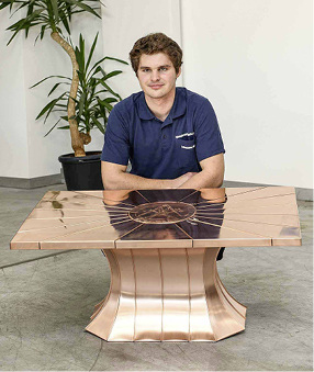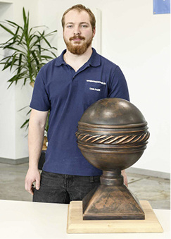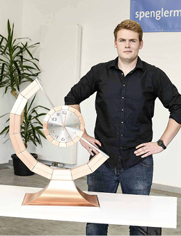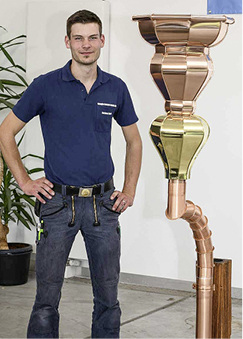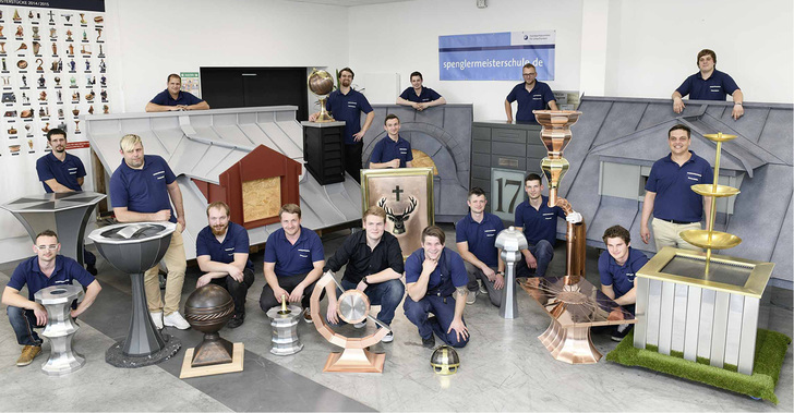 Klassisch, ausgefallen oder zweckmäßig sind sie – die Meisterprüfungsprojekte der Würzburger Spenglermeisterschule. Wir erinnern uns: Anfang des Jahres sorgten Würzburger Spenglermeister auf der Dach + Holz mit starken Arbeiten für Furore. Im Rahmen des beliebten BAUMETALL-Leserwettbewerbs „Meisterstück des Jahres“ sicherten sie sich gleich mehrere Spitzenpositionen. Entsprechend stolz war Meistermacher Arno Fell auf seine Zöglinge. Und auch in diesem Jahr gelang es ihm, seine Meisterschüler so perfekt auf die praktische Prüfung vorzubereiten, dass diese abermals mit Höchstleistungen glänzten. Das Ergebnis sind verzierte Kupferkugeln, komplexe Rinnenkästen oder ausgefallene Klempnermöbel. Präsentiert wurden diese neben diversen Dachmodellen und in unmittelbarer Nähe zum BAUMETALL-Messeplakat mit den Meisterstücken der Jahre 2016 und 2017.