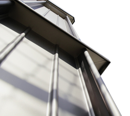 Die Unterkonstruktion der Fenstersims- und Attikaprofile besteht aus einzelnen, konisch geformten Gefällekonsolen und darauf montierten, durchlaufenden Auflageprofilen aus walzblankem Metall. Die Konstruktion ist so stabil, dass sie problemlos betreten werden kann. Außerdem wirkt die konische Bauform Pfützenbildung wirkungsvoll entgegen. Raffiniert sind auch die formschlüssig mit den Auflageprofilen verbundenen Belüftungsprofile. Auf einer Streifenstanze hergestellt und mit Langlöchern versehen, sorgen sie für die perfekte Hinterlüftung der Fassade. Der Clou: Die Belüftungsprofile bestehen ebenso wie die Fenstersims- und Attikaprofile aus zur Fassade passendem, bandeloxiertem Aluminium von Kalzip.