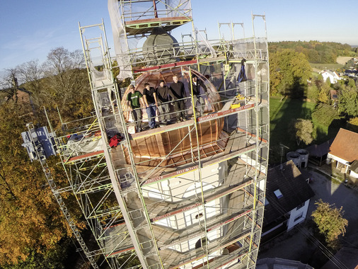 Übrigens: Mit seinen nahezu 100 m² Fläche ist das glänzende Kupferdach des Obergriesbacher Turmes weithin zu sehen. Inzwischen nicht mehr zu sehen sind zahlreiche Dokumente und die Fotos der Beteiligten. Einer alten Tradition folgend wurden diese und andere Unterlagen in einer kupfernen Plombe verwahrt und anschließend auf der Turmspitze platziert. Hand aufs Spenglerherz – hoch oben über den Dächern für lange Zeit verewigt zu werden ist für jeden metallverliebten Spengler immer wieder etwas Besonderes.
