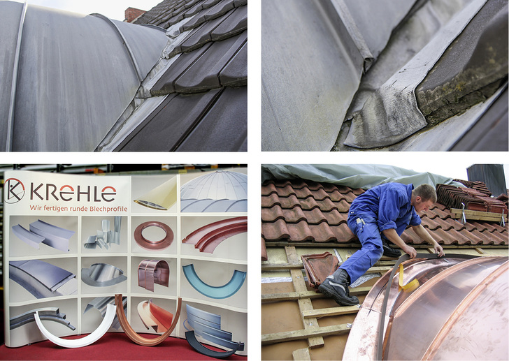 Wie lange diese aus Bleinoggen hergestellte Kehle noch funktionstüchtig ist, oder ob die Konstruktion bereits durch unbemerkten Wassereintritt beschädigt wird, ist nicht bekannt. Sicher ist jedoch, dass Rundbogengauben und vor allem Bogen- oder Kurvenkehlen, mit Systemprofilen der Krehle GmbH bedeutend besser gelingen. Als Kurvenkehle bezeichnet man die Anschlussteile zwischen dem runden Gaubendach und dem Hauptdach. Anstatt die gebogene Kehle unter sehr großem Zeit- und Materialaufwand mühevoll von Hand zu fertigen, bietet Krehle die Möglichkeit, maßgefertigte Kurvenkehlen zu bestellen. Die aus allen gängigen Baumetallen passgenau gefertigten Profile sind perfekt abgewickelt und komplett zusammengefalzt. Die Einzelteile werden montagefertig nummeriert und in kurzer Zeit sicher verpackt geliefert. Die exakte Kurvenkehl-Passform erleichtert nicht nur die Montage extrem, sondern vermittelt darüber hinaus einen überaus professionellen Eindruck. Kurvenkehlen von Krehle sind seit vielen Jahren ein Garant für Sicherheit und wirtschaftlichen Erfolg.