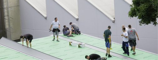 Es ist Donnerstag, der 7. Juni – früh rücken wir aus nach Backnang, um bei strahlender Sonne die knapp 100 m 2 Dachfläche eines Solar-Carports mit farbbeschichtetem Aluminium in Grau einzudecken. Da die Sonne mit 1370 W/m 2 (auch die Solarkonstante genannt) brutzelt, wird uns sonnenklar vor Augen geführt, dass man diese Energie wohl durchaus auch zum Autofahren nutzen kann. An den beiden Tage zuvor hatten die Technikerschüler der Robert-Mayer-Schule die Stahlkonstruktion samt Holzschalung erstellt. Nun sind wir Klempner dran. Freundlicherweise warten die dicken Gewitterwolken am Himmel, bis wir den letzten Falz geschlossen haben, bevor sie sich entladen.