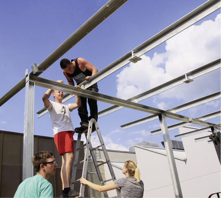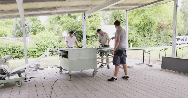 Zuvor hatten sich 24 Stahlbau-Technikerschüler und 12 angehende Klempnermeister zusammengeschlossen und das Schulprojekt zu Hause gut vorbereitet. Es galt, die Statik, die 3D-Konstruktion, 2D-Werkpläne und etliche Materiallisten anzufertigen. Betreut wurden sie dabei von Ausbilder Hans-Peter Rösch, der beide Schularten an der Robert-Mayer-Schule leitet. Die Metallbaulehrlinge schweißten die Konstruktion unter Aufsicht der Stahlbau-Meisterschüler zusammen, die Klempner entwarfen die topmodernen Details und kümmerten sich um Profimat, Kantbank und den Materialtransport. Eine Solarfirma bewerkstelligte den Rest – aber auch das wäre für einen Klempner kein Hexenwerk.