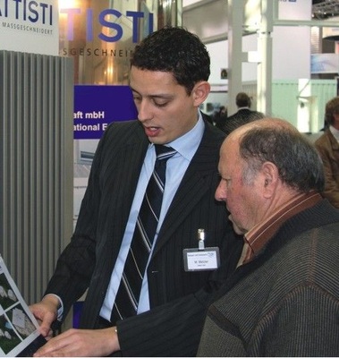 Am Gemeinschaftsstand der Warengruppe Edelstahl Rostfrei informierte Battisti-Geschäftsführer Marc Metzler gemeinsam mit Produkt und Anwendungstechniker Marcel Terhoeven über die Vorteile von Roofinox, beispielsweise der verkupferten Variante des rostfreien Werkstoffs.