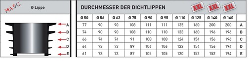 Kaum ein Dichtungselement ist vielseitiger einsetzbar als die „Universal Rückstaudichtung“ von M.A.S.C. Nur wenige Dichtungselemente machen die unüberschaubare Armada verschiedenartigster Roll- und Dichtungsringe nahezu überflüssig und auch der verzweifelte Griff zum Dichtstoff aus der Tube gehört endlich der Vergangenheit an. Mit nur zehn unterschiedlichen Dichtungen können Bereiche von 61 bis zu 200 mm Durchmes-ser abgedeckt werden. Jede der zehn „Universal Rückstaudichtungen“ verfügt über fünf Dichtlippen und folglich über einen sehr flexiblen Passbereich. So können beispielsweise 110-mm-Standrohre (PE, HT, KG) mithilfe der 110-mm-Universal-Rückstaudichtung an 135er-, 133er-, 124er-, 122er- oder 120er-Rohren rückstausicher angeschlossen werden. Auch bei der Verbindung verschiedenartiger Materialien leisten die M.A.S.C.-Dichtungselemente wertvolle Dienste. Zu den zahlreichen Anwendungsbeispielen gehören unter anderem der Anschluss von 50er-HT-Rohren an 60er- Regenfallrohren aus Metall oder aber die Verbindung von Altbau-Gußrohren mit Kunststoffleitungen aus HT-Material.