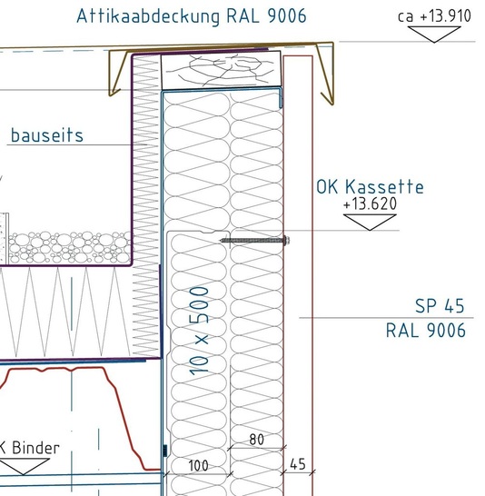 Die optimale Kombination von Antrieb und Verbindung entpuppte sich auch bei der Montage der silbergrauen Gebäudehülle als ideales Konzept. Ohne die geeigneten Antriebe in Bohrmaschinen, Nietgeräten und Blechbearbeitungswerkzeugen wäre die Montage von Unterkonstruktionen, Anschlüssen und Wellprofilen undenkbar gewesen. Dazu, und gleich in tausendfacher Stückzahl, kamen bauaufsichtlich zugelassene Fassadenanker, Bohrschrauben und Nieten zum Einsatz. Sie sorgten für die dauerhafte Verbindung einzelner Bauteile. Fest- und Gleitpunkte wurden dabei ebenso sicher ausgeführt, wie thermisch getrennte Verbindungen oder mit Dichtelementen gegen Niederschlagswasser gesicherte Befestigungspunkte. Doch auch bei der Produktion der Fassadenbauteile – speziell bei der Herstellung der Anschlussprofile – spielten Antrieb und Verbindung eine entscheidende Rolle. So wurde beispielsweise zur Formgebung der Aluminium-Dachrandprofile solide Biegetechnik eingesetzt.
