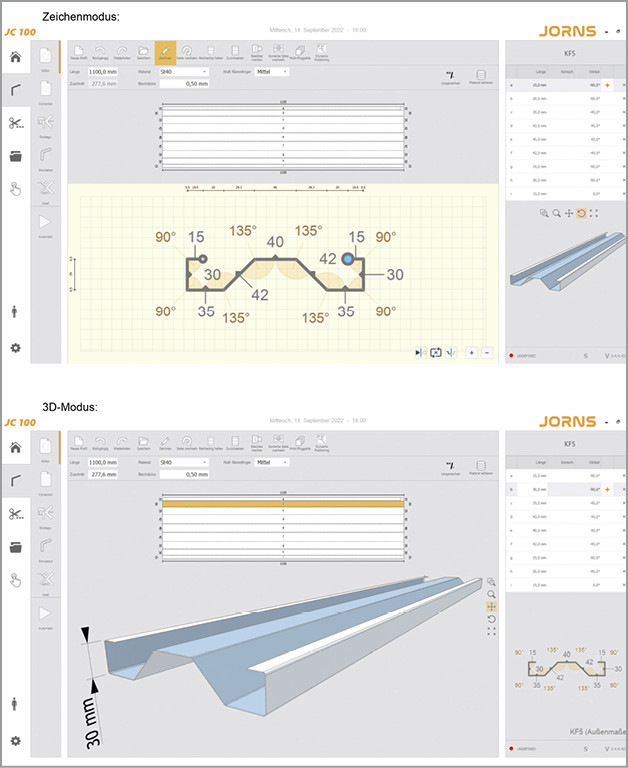 Neu bei Jorns ist die Steuerung JC100. Mit zunehmender Funktionalität der Biegemaschinen, vorhandenen Schnittstellen zu übergeordneten Softwarelösungen oder der Anbindung an Automatisationslösungen hat die Jorns AG vor 6 Jahren das Projekt zur Entwicklung einer komplett neuen (!) Steuerungsgeneration mit dem Wiener Unternehmen Microsea gestartet. Nach der erstmaligen Präsentation der neuen Maschinensteuerung JC100 (JC = Jorns Control) für die Jorns-Doppelbiegemaschine JDB auf der Euroblech 2022 ist die Steuerung jetzt auch für die Jorns-Biegemaschine JB bestellbar. Ergänzend dazu kann die Office-Software JC100 Office auf einem Büro-PC installiert werden, um maschinenspezifische Biegeprogramme für Jorns-Biegemaschinen zu erstellen. Maschinenparameter und Biegeprogramme werden dabei über gemeinsame Bibliotheken synchronisiert. Ebenfalls neu ist die direkte Schnittstelle der Maschinensteuerung zur Bendex Enterprise Suite. Die direkte Integration ist überaus praktisch: Beispielsweise kann ein Biegeprofil mit Kantungen, Ausklinkungen, Löchern und Gehrungsschnitten mithilfe der JC100 direkt aus dem übergelagerten Bendex Enterprise Suite System bezogen werden. Ein manueller und dateibasierter Datenexport in einem Übergabeformat wie bspw. XML ist somit nicht mehr nötig, kann aber für andere Systeme/Software weiterhin eingesetzt werden. Darüber hinaus bieten Jorns und Krasser eine direkte Schnittstelle an. Dadurch kann mit der JC 100 auf der Biegemaschine ein Zuschneideauftrag definiert werden. Der Vorteil: Biegeprofile können mit entsprechender Abwicklung und Länge, Profilname, Stückzahl, Materialart und Materialstärke an Krasser exportiert werden. Auf der Krasser-Spaltanlage werden dann die benötigten Zuschnitte hergestellt und mit einem Identifikationskleber inklusive QR-Code versehen. Dieser stellt wiederum die Schnittstelle zum Biegeprogramm sicher, da mit dem Scannen des Codes das dazu passende Biegeprogramm an der JC100 aufgerufen werden kann.