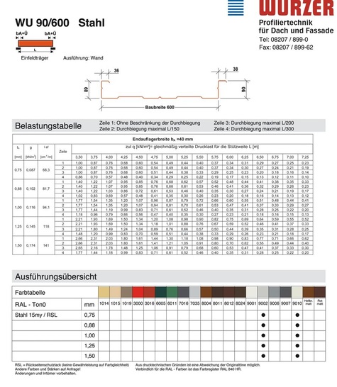Die Wurzer GmbH in Affing (Bayerisch Schwaben) bringt als erster Hersteller Kassettenprofile mit 180 und 200 mm auf den Markt. Hauptvorteil der neuen Kassetten ist, dass sich damit größere Spannweiten überbrücken lassen, weil das höhere Profil auch eine höhere Tragfähigkeit bringt. Erwünschte Zusatzeffekte der höheren Kassetten sind bessere Wärme- und Schallschutzeigenschaften. Bei den neuen, hohen Kassettenprofilen kann eine Wärmedämmung mit bis zu 200 mm Dicke eingebaut werden. Wenn zusätzlich die Kassettenstege durch Dämmstreifen belegt werden, ist ein optimaler Wärmeschutz erreichbar. Der bessere Schallschutz resultiert aus dem erhöhten Abstand der beiden Wandschalen voneinander. Die neuen Kassetten in den Maßen 180/600 und 200/600 sind in Stahl in der gängigen RAL-Farbpalette lieferbar.