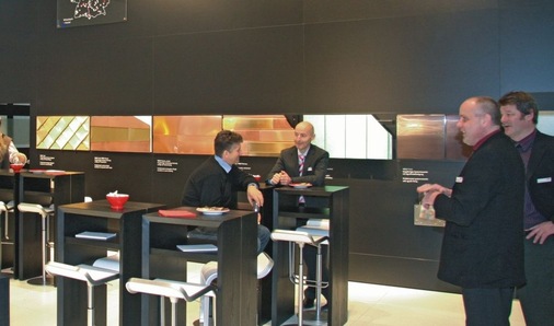 Auf dem KME-Messestand wurden alle Fragen zu den bewährten Tecu-Produkten beantwortet. Die Tecu-Partner aus Osnabrück informierten beispielsweise über walzblanke Kupfercoils, patinierte Kupfertafeln oder Streckgitter aus Tecu-Oxid. Doch auch zahlreiche Sonderlösungen, etwa die geprägten Kupfer-Oberflächen, wurden vorgestellt. Und weil Fachgespräche unter Partnern stets wichtig sind, lud KME seine Tecu-Partner zu einem unvergesslichen Tecu-Partner-Netzwerk-Abend ein.