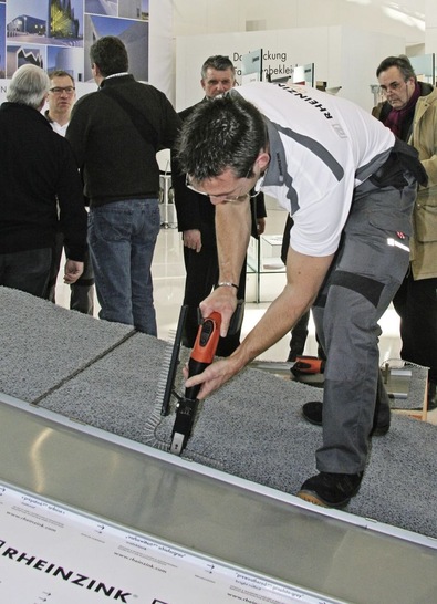 Inzwischen ist man bei Rheinzink ein gutes Stück weitergekommen. Das Ergebnis ist ein ausgereiftes und umfassend geprüftes System für Stehfalzdächer, das nicht nur stabiler ist als die bislang eingesetzten Befestigungsmethoden, sondern auch in puncto Bearbeitungszeit und Wirtschaftlichkeit überzeugt. Eine zehn Jahre währende Garantie zeigt sehr nachdrücklich, dass es den innovationsfreudigen Dattelnern ernst ist – die positiven Reaktionen der Messebesucher sind beachtlich.