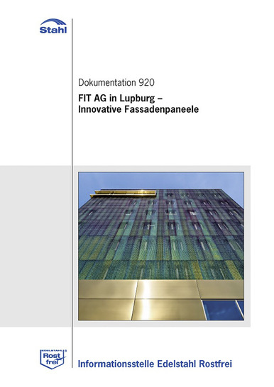 Dass eine Fassade mehr ist als die Außenhaut eines Bauwerks, ist Planern wie Bauherren gleichermaßen bewusst. Sie ist zugleich Aushängeschild für das darin ansässige Unternehmen und trägt dessen Image d nach außen. Im oberpfälzischen Lupburg verleiht die Fassade des neuen siebengeschossigen Verwaltungsgebäudes der FIT AG dem international erfolgreichen Unternehmen für additive Fertigung edlen Glanz. Wie aus der Idee einer Fassade in 3D-Struktur eine weithin schillernde, chamäleonartige Gebäudehülle entwickelt wurde, wird in der neuen Dokumentation 920 „FIT AG in Lupburg – Innovative Fassadenpaneele“ eindrucksvoll erläutert. Die Broschüre beinhaltet Fotos und ergänzende Zeichnungen zu diesem Bauwerk. Die Informationsstelle Edelstahl Rostfrei (ISER) setzt hiermit die Reihe innovativer Ausführungsbeispiele im Bauwesen fort. Mithilfe der klassischen Verarbeitungstechniken Stanzen, Prägen und Kanten und der elektrochemischen Färbung ist eine Fassade entstanden, die von außen geschlossen wirkt, die aber von innen eine hohe Transparenz bietet. Sogar im Treppenhaus setzen diese Paneele glänzende Akzente. Die Dokumentation kann in Einzelexemplaren kostenfrei bei der Informationsstelle Edelstahl Rostfrei angefordert werden. Sie steht auch auf der Internetseite der ISER zum kostenfreien Download bereit. Weitere Informationen zum Projekt sind auch auf der Internetseite des ausführenden Fachbetriebs, der Lummel GmbH & Co. KG aus Karlstadt am Main, abrufbar.