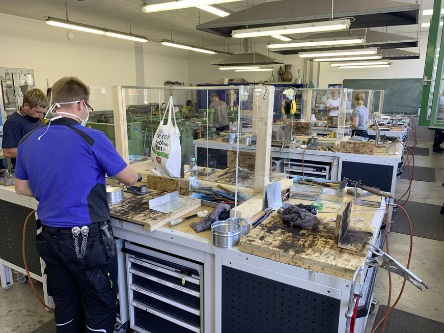 Am 17. August 2020 ist am Bundesbildungszentrum des Deutschen Dachdeckerhandwerks in Mayen der Vorbereitungskurs zur Klempnermeisterprüfung gestartet. 16 Teilnehmer – damit ist der Kurs ausgebucht – werden sich bis kurz vor Weihnachten auf die anschließend stattfindende Meisterprüfung in den Teilen I und II vorbereiten. Auf die traditionelle Eröffnungsfeier mussten eine Dame und die Herrn in diesem Jahr verzichten. Stattdessen waren Hygienemaßnahmen, das Tragen eines Mund-Nasen-Schutzes sowie durch Plexiglas abgetrennte Arbeitsbereiche das Thema des ersten Tages. „Ein besonderer Kurs in einer besonderen Zeit!“ Mit diesen Worten versprach BBZ-Geschäftsführer Rolf Fuhrmann den Teilnehmern die volle Unterstützung des gesamten BBZ-Teams und stellte die Ampel des Kurses auf Grün.