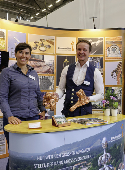 Das Ehepaar Müller kennt sich mit der Herstellung von Zierelementen aus Metall, Ornamenten und dem Metalldrücken bestens aus. In dritter Generation leiten sie den 1953 gegründeten Familienbetrieb Müller. Kupfer-Turmspitzen, vergoldete Kreuze oder kunstvoll geschwungene Stehfalzbedachungen zählen zu den Schwerpunkten des Traditionsunternehmens. Außerdem befasst sich das Ehepaar mit Vergoldungen, aufwendigen Restaurierungen oder seilunterstützter Höhenarbeit. Das Begleiten der Kunden vom ersten Moment an, das dazugehörende Planen sowie die Erfüllung individueller Kundenwünsche gehören ebenfalls zum Service des Unternehmens. Darüber hinaus veröffentlichen die Fachleute regelmäßig Fotos von Referenzprojekten und informative Videos im Internet. Speziell die Müller-Filme zeigen, was Metalldrücker leisten, und sorgen so dafür, dass die Öffentlichkeit mehr über die enorme Handfertigkeit metallverarbeitender Spezialisten erfährt.