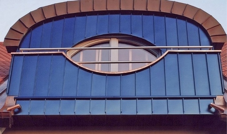 An einer größeren Dachgaube eines Wohnhauses in Eichsfeld war die putzüberzogene WDVS-Fassade im Laufe der Zeit sehr unansehnlich geworden. Schlimmer noch: Der Bauherr hatte feuchte Stellen an der Fassade entdeckt. Neben dem bombierten Dach wurden unterschiedliche Anschlüsse sowie die Dachränder ebenfalls mit zum Teil sehr aufwendigen Kupferprofilen ausgestattet. Der Balkonboden wurde mit Edelstahl der Marke Uginox abgedichtet. Berechtigterweise begaben sich der beauftragte Architekt sowie der Bauherr auf die Suche nach einem beständigen Fassadenelement. Gefordert war ein System, welches die Fassade über einen langen Zeitraum in optisch ansprechender Weise erhält. Die Entscheidung fiel schließlich auf blau gefärbten Edelstahl, der bedingt durch seine Korrosionsbeständigkeit Sicherheit für die nächsten Generationen und gleichzeitig durch die farbige Oberfläche eine einzigartige Optik bietet.