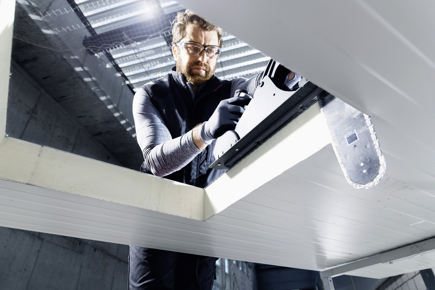 Im Industrie- und Gewerbehallenbau sind polyurethangeschäumte Sandwich-Paneele ein bevorzugter Werkstoff. Dabei nennen Hallenbauer vor allem das Einbringen von Ausschnitten für Fenster, Türen und Tore als besondere Herausforderung. Stichsägen sind am Ende des Sägeblatts wenig stabil, weshalb der Schnitt im unteren Blechbereich oft wellenförmig verläuft. Kreissägen schneiden wiederum wegen des runden Sägeblattes auf der Unterseite kürzer als oben. Folglich sind Gegenschnitte erforderlich, was Zeit kostet und relativ ungenau ist. Als beste Lösung gelten daher die modernen Panel Cutter TruTool TPC 165 von Trumpf. Das Werkzeug verfügt über ein stabiles Kettenschwert, das ohne Startlochbohrung an jeder beliebigen Stelle in das Verbundmaterial eintaucht – maßgenau und mit einem Winkel von bis zu 90 Grad. So angestellt, trennt es im rechten Winkel bis zu 165 Millimeter dicke Sandwich-Paneele mit Ober- und Unterblech aus Aluminium oder Stahl. Dabei spielt es keine Rolle, ob die Oberfläche plan, gewellt oder als Trapez ausgeführt ist. Dank des innovativen technischen Aufbaus kann das TruTool TPC 165 auch an bereits montierten Paneelen problemlos eingesetzt werden. Die Arbeitsgeschwindigkeit liegt bei bis zu 4 m/min. Mit einem Gewicht von weniger als 10 kg und ergonomisch gestalteten Handgriffen lässt sich mit dem Paneel Cutter zudem lange und ermüdungsarm arbeiten.