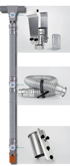 Alle Einhängestutzen, Adapter, Schläuche und das Endstück werden mit dem gleichen Stecksystem verbunden, wodurch ein individueller Einsatz für verschiedenste Gebäude möglich wird. Weitere