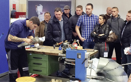 Mit gewohnt professionellen Live-Vorführungen präs entierten Ausbilder und Meisterschüler der Spengler-Meisterschule Schweinfurt, wozu Spengler in der Lage sind. Sie bekleideten zahlreiche Dachmodelle mit unterschiedlichen Baumetallen und stellten Meisterstücke vor, die es beim BAUMETALL-Leserwettbewerb Meisterstück des Jahres ausgezeichnet wurden. Neben der Bekleidung eines Zwiebelturmes wurden auch kubische Fassaden bekleidet oder Dachdurchdringungs-Verwahrungen und geschwungene Rinnenkessel vor den Augen zahlreicher Zuschauer angefertigt.