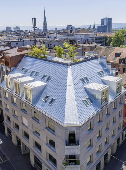 Ein Neubau im Züricher Kreis 4 (Chreis Cheib) – genauer gesagt an der Ecke Lang- und Brauerstraße – überrascht mit einem formvollendeten Aluminiumdach. Geplant wurden Gebäude und Dachfläche samt Doppelstehfalzdach von den Züricher Architekten Penzel-Valier Architektur GmbH – ausgeführt wurden die Spenglerarbeiten vom Züricher Fachbetrieb Scherrer Metec AG. Der Dacheinteilung liegt ein Schar-Achsmaß von 430 mm zugrunde. Die entsprechende Falzführung wurde auf die Positionen markanter Dachlukarnen und zahlreicher Dachfenster abgestimmt. Letztere wurden so eingebaut, dass sie den Rhythmus des Falzbildes nicht beeinflussen und dementsprechend integriert wirken.