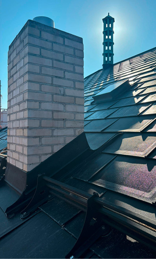 Für die umfangreichen Dacharbeiten wurden rund 1900 m² Gerüst benötigt. Vor dem Montagestart der Solardachplatten sowie dazugehörender Aluminiumdachplatten und Anschlussprofile musste das ursprüngliche Asbestdach der Kirche entfernt und fachgerecht entsorgt werden. Im nächsten Schritt erfolgte die Ertüchtigung bzw. Überprüfung der Holzunterkonstruktion. Traufseitig befestigten die Dachprofis von Achtelstetter drei Reihen der Prefa-Dachplatte R.16 sowie ein dazu passendes Schneerechensystem. Mit ihrer direkten Befestigung an der integrierten Haftleiste erleichtern R.16-Dachplatten das Spengler-Arbeitsleben enorm. Durch ihr großes Format mit 70 cm Elementlänge und 42 cm Elementbreite kann 1 m² Dachfläche mit nur 3,4 Dachplatten gedeckt werden. Das mit lediglich 2,5 kg/m² leichte System ist bereits ab einer Mindestdachneigung von 17° einsetzbar.