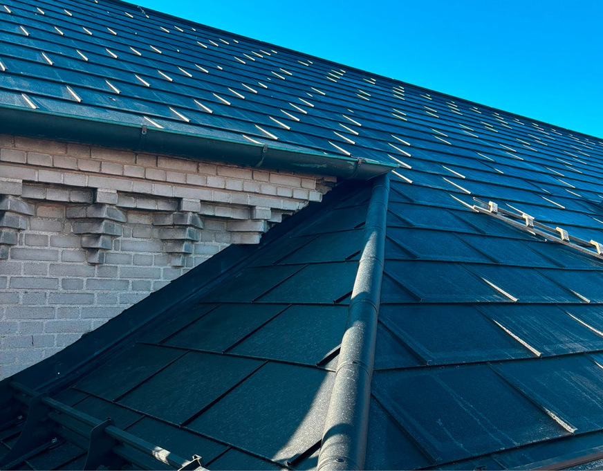 Am hier vorgestellten Projekt wurde die Dachplatte R.16 auch über den großflächig angeordneten Solardachplatten und somit als Abschluss- und Übergang am First des Satteldachs eingebaut – ebenso an den Anschlussbereichen zum Giebel und anderen Dachbereichen. Die einfache Kombination mit der Solardachplatte macht die R.16 folglich zu einem echten Allrounder.
