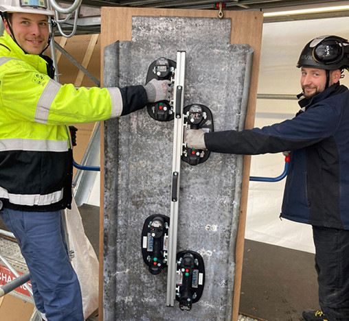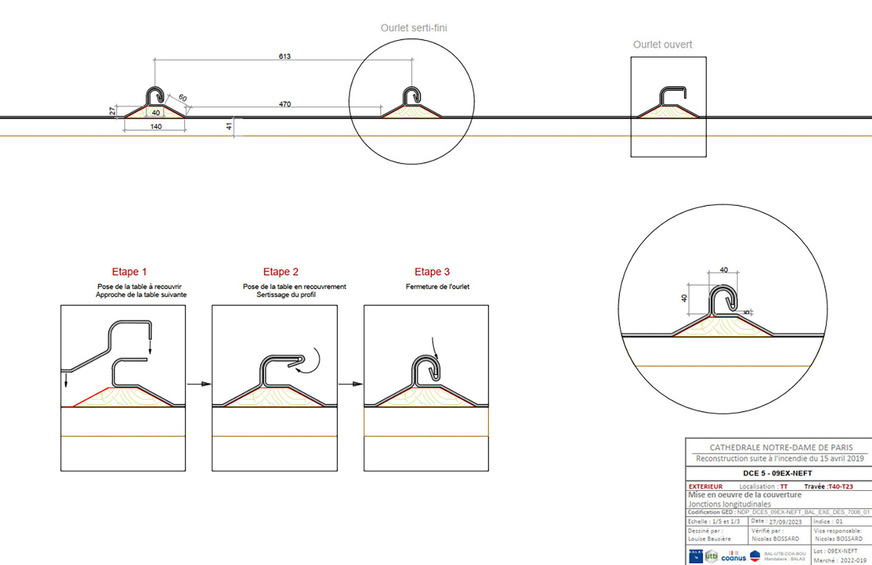 Jedes einzelne der erforderlichen Dachelemente wurde zunächst als Prototyp gefertigt. Es folgten die Begutachtung und die Freigabe durch den leitenden Architekten Philippe Villeneuve. Erst dann startete das Werkstatt-Team mit der Serienproduktion bzw. der Reproduktion der benötigten Stückzahlen. Um die Verarbeitung zu erleichtern und die körperliche Belastung der Mitarbeitenden zu reduzieren, hat das Unternehmen in mehrere Spezialmaschinen investiert. Darunter eine motorische Schröder-Schwenkbiegemaschine vom Typ PowerBend Professional mit drehbarer Oberwange sowie diverse Hebevorrichtungen und elektrisch betriebene Vakuumheber. Außerdem wurden spezielle Werkzeuge zur Weiterverarbeitung der gerollten Bleinähte entwickelt.