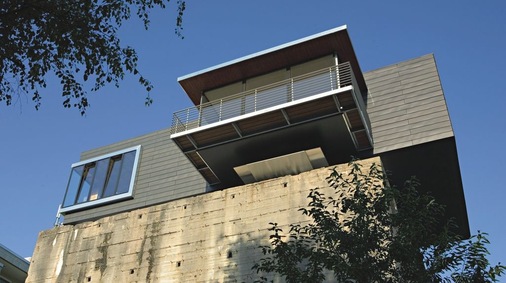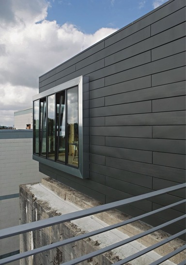 Die ungewöhnliche Umnutzung eines Hochbunkers im nordrhein-westfälischen Hamm ist solch ein Objekt. Mitten in der Innenstadt scheint ein Penthouse über einem Hochbunker aus dem zweiten Weltkrieg zu schweben: Die Hybridkonstruktion aus Stahl und Holz besteht aus zwei länglichen Boxen, die einen L-förmigen Grundriss bilden. Für die Fassade des größeren der beiden Riegel entwickelte Architekt Mick Amort vom Architekturbüro Archivolver aus Bonn eine spezielle Zink-PaneelKonstruktion in der Oberflächenqualität Anthra-Zinc des Herstellers VM-Zinc aus Essen.