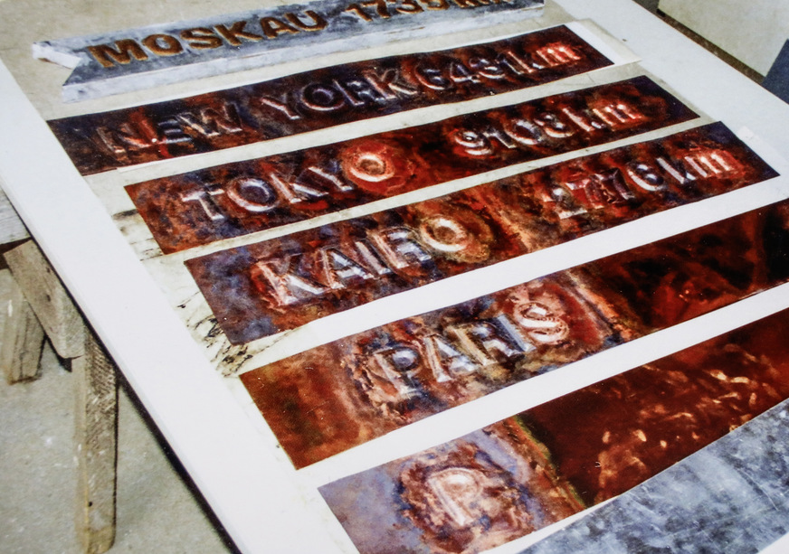 Tatkräftige Unterstützung bekam ich von zwei alten Freunden, beide übrigens keine Spengler. Ronny, von Beruf Malermeister und als Berufsschullehrer tätig, übernahm den wichtigen gestalterischen Teil. Alle Buchstaben und Zahlen wurden von ihm in schönster Schrift seitenverkehrt auf die verwendeten Kupferbleche geritzt. Leider hat er die Fertigstellung wegen einer bösartigen Krankheit nicht mehr erleben dürfen. Jetzt brauchten wir diese Linien nur noch herauszutreiben. Die verwendeten Punzen sind alle selbst angefertigt und waren in ihrem „ersten Leben“ kleine Meisel und Dorne. Ein Kupferschmied hätte bei unserer unprofessionellen Arbeit bestimmt die Hände über dem Kopf zusammengeschlagen, aber die Resultate waren gar nicht so übel. Bei diesen Arbeiten unterstützte mich Stefan, eigentlich gelernter Koch und Kraftfahrer. Außer mit vielleicht Backblechen hatte er mit Blech bislang recht wenig zu tun. Nach einem Schnellkurs in Blechbearbeitung arbeiteten wir oft gemeinsam an den Wochenenden in meiner kleinen Klempnerwerkstatt. Im ersten Jahr entstand das Grundgestell, das in etwa die Form eines kleinen Baumes mit drei Ästen hat. Das wurde alles aus 25 bis 30 cm langen Kupferfallrohrstücken verschiedener Dimensionen angefertigt. Alle Verbindungen wurden gefalzt und von innen verlötet. Nachdem der noch leere Schilderbaum fertig war, begannen wir im zweiten Jahr mit den Schildern. Zehn bekannte Ortsnamen aus aller Welt haben wir ausgewählt. Auswahlkriterien waren die Namenslänge und natürlich sollte auch jeder Kontinent vertreten sein. Als Zugabe, die aber unbedingt an solch einen Wegweiser gehört, wurden die vier Himmelsrichtungen, natürlich ebenfalls in Kupfer getrieben, montiert. Um die herausgetriebenen Buchstaben und Zahlen optisch hervorzuheben, wurde der Untergrund komplett verzinnt. Einige Jahren der Witterung ausgesetzt, sollten dann die dunkelbraun oxidierten Zeichen auf grauer Fläche gut zu erkennen sein. Was sich hier in wenigen Minuten liest, dauerte einige Jahre. Die Abstände zwischen den Arbeitswochenenden wurden auch immer größer. Während wir zu Beginn noch akribisch unsere Arbeitsstunden notiert haben, wurde das irgendwann eingestellt. Interessant zu wissen, wäre vielleicht, wie viele Flaschen Bier wir bis zur Fertigstellung konsumiert haben ... Nach manchen Arbeitseinsätzen war die Anzahl leerer Bierflaschen größer als die Zahl der geleisteten Arbeitsstunden! Nach knapp 10 Jahren hatten wir es geschafft: Der Wegweiser war fertig.