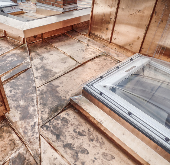 Falzdachtechnik ist zwar keine Raketenwissenschaft, aber zumindest für Branchenfremde ein Buch mit sieben Siegeln. Vor allem dann, wenn Detailpunkte derart kompliziert sind wie beim hier vorgestellten Projekt. Wunderlich orientierte sich bei der Falzführung sowie entsprechenden Ausklinkungen und Falzvorbereitungen an den Hinweisen des Lehrbuchklassikers „Die Fachkunde der Bauklempnerei“ von Herbert Schlenker. Dies trifft besonders bei der Ausführung niedergelegter Anschlussfalze zu. In der Folge wurden zahlreiche Profile in Sonderformen profiliert. Sozusagen als Königsdisziplin erfolgte die Anfertigung kleinteiliger Stehfalzscharen in Dreieck- und Trapezform. Der Einbau erfolgte beispielsweise zwischen Schornsteinen, Lichtkuppeln und Lüfterfirsten.