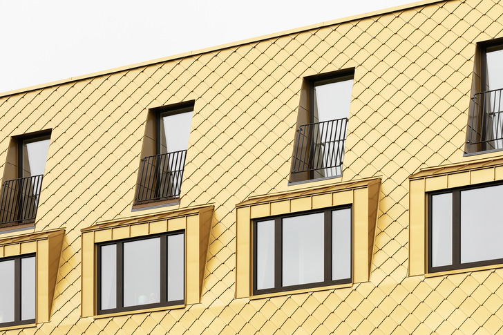 Die Gebäudehülle unterstützt die leichte Bauweise, die gefordert war, um die Traglasten für das Bestandsgebäude aus den 1950er-Jahren zu begrenzen. So wiegt eine Raute nur rund 217 g. Das entspricht einem Gewicht von 2,6 kg pro m². Die aufgestockten Außenwände und Mansarddachflächen wurden nicht tragend und nicht ausgesteift in Holzbauweise ausgeführt. Als Unterkonstruktion für die Bekleidung dient eine 24 mm starke Holzschalung. Die Aluminiumfassade verbindet die drei Etagen, die durch die Aufstockung hinzukamen, optisch zu einer Einheit. Die Fassade geht ohne Fuge und ohne einen Wechsel der Farbe oder des Materials ins Mansardendach über. Lediglich ein dezenter Knick deutet den Verlauf der Traufkante unter dem fünften Stockwerk an. Die Aluminiumrauten harmonieren farblich mit der gut erhaltenen Bestandsfassade aus gebrannten Gelbklinkern, die bewahrt wurde. Beide Farbtöne sind jedoch nicht identisch. Zudem unterscheiden sich der Werkstoff Aluminium und das Rautenraster von den Klinkersteinen, sodass die Aufstockung als neuer, zeitgemäßer Baukörper wahrnehmbar bleibt, ohne allzu stark hervorzustechen.
