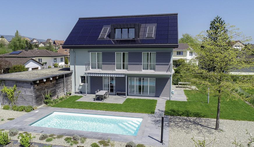 Entsprechende Platten wurden an allen Anschlüssen, wie Dachfenstern und Lukarnen, konisch gefräst, genutet und gekantet und anschließend in das Befestigungssystem der PV-Anlage integriert montiert. Die beiden Hauptdachflächen des Satteldaches in Ost-West-Ausrichtung wurden mit einer integrierten Photovoltaikanlage des Thuner Herstellers 3S Solar Plus AG ausgestattet. Das Vorzeigeobjekt wurde im Jahre 2019 durch den Solarpreis Schweiz mit einem Diplom in der Kategorie PlusEnergieBau ausgezeichnet.