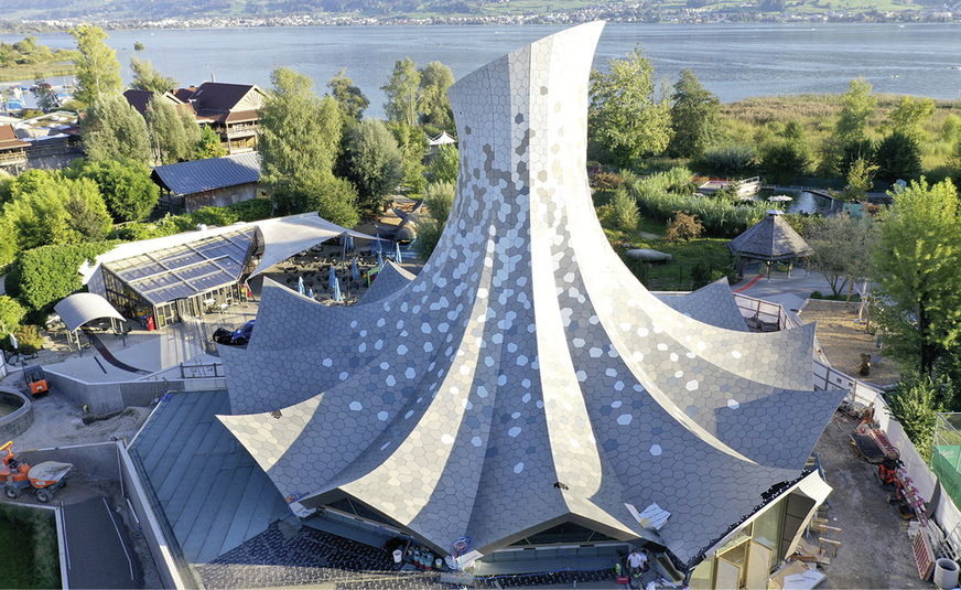 500 Personen. Für die Bekleidung der außergewöhnlichen Dachkonstruktion zeichnet das Team des Fachbetriebs Beat Brönnimann GmbH aus St. Gallen verantwortlich. Auf der ausgeschwungenen Holzkonstruktion wurde zunächst ein absolut dichtes EPDM-Unterdach (Resitrix) aufgebracht. Anschließend erfolgte das Setzen der Metallelemente und entsprechender Unterkonstruktionsträger mithilfe vorgefertigter Schablonen. Die Zuschnitte der rund 7500 Zink-Verbundplatten wurden auf einer CNC-Fräse hergestellt. Aufgrund der komplexen Geometrie wurde jedes Zinkelement einzeln gefertigt und nummeriert. Eine logistische Meisterleistung war mit der Vormontage der Zinkelemente auf den Holzbausegmenten verbunden. Dabei mussten die Bauteile so befestigt werden, dass sich einzelne Baugruppen sicher transportieren und vor Ort passgenau zusammensetzen ließen. Beim finalen Zusammensetzen der einzelnen Elemente war es besonders wichtig, ein harmonisch fortlaufendes Fugenbild zu berücksichtigen.