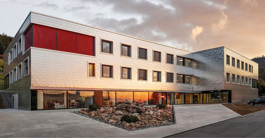 Abertausende Aluminiumschindeln wurden in der Spenglerwerkstatt von Hand gefertigt. Sie bestehen aus walzblankem Material mit einer Dicke von 0,80 mm. Ihre Abmessungen betragen 320 x 570 mm. Das Material verleiht der Fassade eine Chamäleon-Optik, denn in der Fassadenoberfläche spiegelt sich, den unterschiedlichen Tages- und Jahreszeiten entsprechend, die umgebende Natur wider.