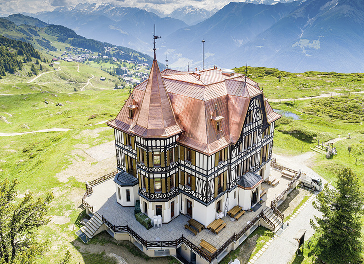 Diese überaus erhaltenswerte, um 1900 im viktorianischen Stil erbaute Villa wurde im Sommer 2019 renoviert. Der Umbau umfasste unter anderem die energetische Sanierung sowie die Überarbeitung des Raumkonzepts. Wichtigster Projektteil war (zumindest aus Spenglersicht) die Gesamtsanierung des 45-jährigen Daches. Dank sehr guter Zusammenarbeit mit Architekt und Bauherrschaft ist es gelungen, eine gewaltige Kupfer-Dachlandschaft zu realisieren. Die Bauaufgabe war angesichts der Dachgeometrie und der hochalpinen topografischen Lage besonders anspruchsvoll. Der ausführende Fachbetrieb G. Bosshard AG aus Altdorf fertigte ein einzigartiges Metalldach im Doppelstehfalzsystem. Das weithin sichtbare, technisch anspruchsvolle Doppelstehfalzdach besteht aus 38 Teilflächen. Das gesamte Kupferdachgefüge besteht aus: