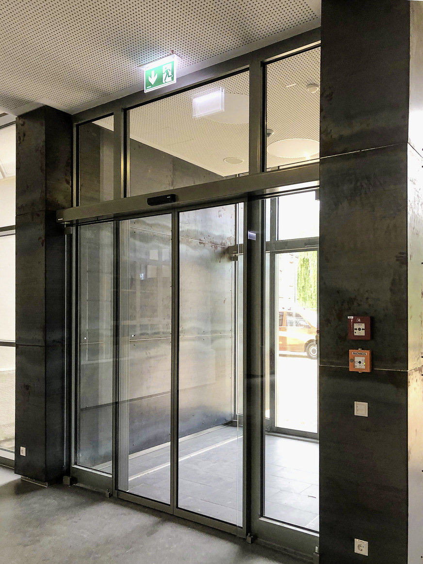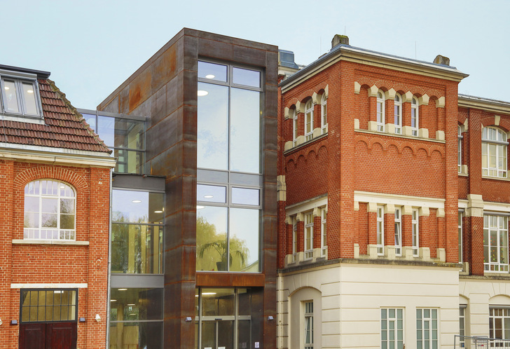 Die Fachleute befestigten die Tafeln an den vier Gebäudeseiten im vertikalen und horizontalen Verlegebild. Dabei legten sie Wert darauf, bestehende Symmetrien durch die Anordnung der Tafeln zu betonen. Gegenüber jedem der Bestandsgebäude wurde die Fassade jeweils vollflächig montiert. An der Seite zur Hauptstraße installierten die Klempner die Tafeln zwischen den schmalen Fenstern. Diese Bekleidung erhöht die Breite der Lisenen, die bereits im Betonrohbau angelegt waren. Der Wechsel aus Glas und Stahl erzeugt eine strenge Struktur paralleler vertikaler