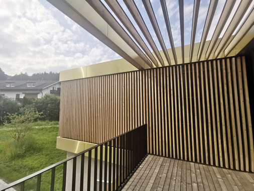 Die Vorfertigung, Lieferung und Montage der horizontal verlaufenden Sockel- und Blendenelemente lag in Händen der Gebr. Adelsberger GmbH aus Waakirchen. Die Spengler um die Geschäftsführer Hermann und Stefan Adelsberger haben ganze Arbeit geleistet: Perfekt vorbereitet liegen die Edelstahlelemente plan auf und rahmen die mit den Werkstoffen Holz und Glas gestalteten Fassaden wirkungsvoll ein. Der warme Goldton verleiht dem Gebäude ein edles und exklusives Erscheinungsbild.