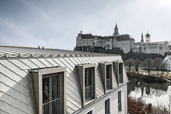 Mit seinen gerade mal 17 000 Einwohnern bietet das baden-württembergische Sigmaringen im Südwesten Deutschlands die oft so beliebte Idylle einer Kleinstadt. Direkt an der Donau gelegen finden Touristen hier eine ruhige Naturoase sowie das historische Aushängeschild der Stadt: das Schloss Sigmaringen. Damit Gäste aus aller Welt rund um die Uhr den Blick auf dieses prunkvolle Bauwerk genießen können, entstand vis-à-vis das „Karls Hotel“, dessen Formensprache zeitgenössische und klassische Elemente miteinander vereint. Die Aluminiumspezialisten von Prefa waren von Anfang an dabei und berichten hier, wodurch sich die Arbeiten an diesem durchaus anspruchsvollen Projekt besonders auszeichnen. Wo sich vor einem Jahr noch eine unbebaute Grünfläche erstreckte, befindet sich heute ein Hotel mit Aluminiumdach. Laut Jonas Neusch von Neusch Architekten strahlt es dank seiner bronzenen Farbgebung Heimeligkeit und Wärme aus. Gegenüber dem Schloss Sigmaringen gelegen, weist der Hotelneubau eine klassische Dreiteilung auf: Die Erdgeschosszone ist als Sockel ausgebildet, der Rumpf beinhaltet die Hotelzimmer und eine zurückhaltende Fassade. Das Dach komplementiert das warme Farbspiel mit Beige- und Sandtönen.