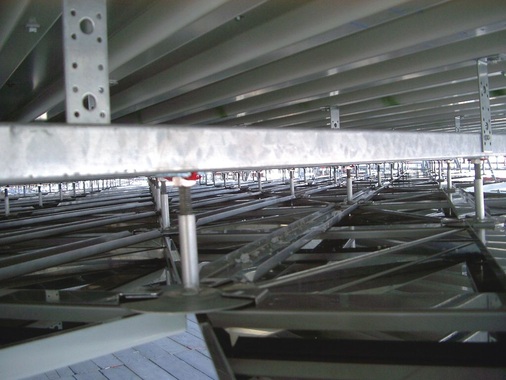 Als primäre Unterkonstruktion wurden, dem Rautenmaß entsprechend, tellerförmige Befestigungsvorrichtungen auf den Stahlprofilen der Tragstruktur platziert. Die sogenannten Befestigungsteller verfügen über mindestens ein Verriegelungselement, mit welchem die Rautenelemente sicher justiert, gehalten und sogar einzeln wieder gelöst werden können. Ermöglicht wird diese dreifache Funktion über eine, auf dem Gewindebolzen aufgeschraubte Gewindehülse. Eine Konterschraube erlaubt die exakte sowie drehfeste Fixierung in axialer Position, ohne die Gleitlagerintegration des Systems zu beeinträchtigen. Um bei der Platzierung der „Teller“ stets das richtige Rautenraster aufzunehmen, fertigten die Spengler aus Karlstadt lange Metallschablonen an, die das mühselige Einmessen einzelner Punkte überflüssig machten. Durch diesen Trick genügte ein, sich wiederholendes und auf der Unterkonstruktion aufgezeichnetes, Referenzliniensystem zur Orientierung.