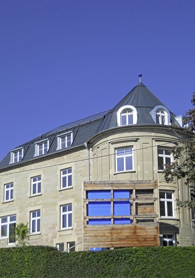 Mit dem Ziel, das im zweiten Weltkrieg teilweise zerstörte und leider nur provisorisch reparierte Dach originalgetreu zu rekonstruieren, suchten der planende Architekt Joachim Friedrich von Berg und der ausführende Architekt Mathias von Poswik nach Möglichkeiten, dem ungewöhnlich geschnittenen Dachgeschoss wertvollen Wohnraum abzuringen. Außerdem sollte der Dachausbau energetisch optimiert und die Dacheindeckung zeitgemäß, wirtschaftlich und dauerhaft dicht ausgeführt werden. Schließlich fiel die Entscheidung (das historische Vorbild war mit Schiefer gedeckt) auf eine Dacheindeckung mit anthrazitfarbenen Aluminiumdachschindeln der Marke Prefa. Die farbbeschichteten Schindeln passen sich optimal an klassische Dachstrukturen an und sind daher hervorragend für Objekte mit älterer Bausubstanz geeignet. In sogenannter ¾-Teilung verlegt entsteht ein wetterfester, sicherer und harmonischer Flächenverbund. Die nötige Sicherheit gewährleisten auf der Schindellängs- und -querseite angebrachte Falze sowie die indirekte Befestigung der Dachschindeln. Ergänzend wurden komplexe Dachbereiche wie die Turmeindeckung oder die flach geneigten Kehl- und Dachbereiche in klassischer Doppelstehfalztechnik ausgeführt. Dabei kamen farblich passende Prefa-Aluminiumbänder zum Einsatz.