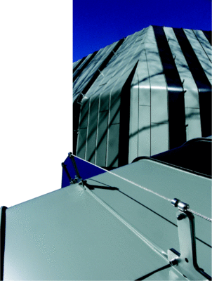 Durch den Einsatz von Foamglas konnte auf eine Holzschalung ebenso wie auf eine Fassadenhinterlüftung verzichtet werden. Die zuvor sorgfältig im Dämmmaterial angeformten Rundungen wurden durch eine entsprechende Profilierung der Scharen passgenau überdeckt. Auf den Winkelstehfalzen aufgeklemmte Drahtseilsysteme aus Edelstahl fungieren als Kletterhilfe für die Fassadenbegrünung. Im Klemmbereich wurden die Winkelfalze doppelt geschlossen. Zur Strukturierung der Aluminiumfassade entschied sich die EnBW Regional AB (Regionalzentrum Stuttgart) mit Unterstützung des Stuttgarter Architekten Robert Brixner für den Einsatz der Falzonal-Standardfarben zinkgrau und anthrazitgrau.
