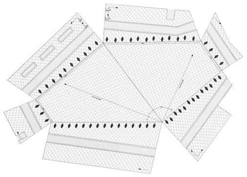 Die zweite Voraussetzung für die homogene Struktur der Hülle ist die Gleichförmigkeit jedes einzelnen der 4500 Paneele. Dies erfordert eine industrielle Fertigung. Die Schindeln wurden mit CNC-gesteuerten Maschinen geschnitten und gefalzt. Der Belüftungsraum des Dachs wird rundherum von 57 Entlüftungsschindeln be- und entlüftet. Deren Öffnungen sind bewusst klein strukturiert, um einerseits die Optik nicht zu zerstören, andererseits Wind und Regen abzuhalten. In jede Belüftungsschindel wurde von einer CNC-Trumpf-Stanzmaschine ein Lüftungsgitter aus 500 Löchern gestanzt. Hinter dieser Öffnung wurde dann ein Blech angenietet. Wie eine Wanne fängt es das vom Wind hereingepeitschte Wasser auf und leitet es durch dieselben Öffnungen wieder nach außen.