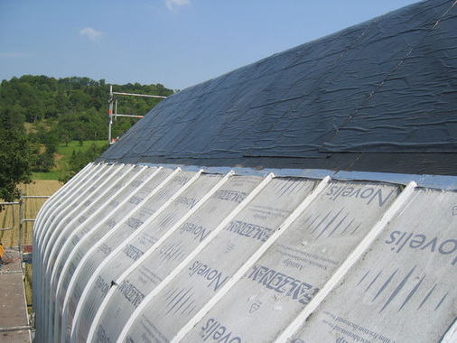 Zur Montage der Aluminiumscharen sind in definierten Abständen Edelstahlkrallenplatten platziert, die zur Befestigung der Hafte des Stehfalzsystems dienen. Sogenannte Durchsteckanker mit Senkkopf fixieren die Krallenplatten im Betonuntergrund. Eine Polymerbitumenschweißbahn überdeckt die Dämmschicht und fungiert gleichzeitig als Sekundärabdichtung. Die Rundungen der direkt auf der Dämmebene aufliegenden Aluminiumeindeckung sind mit größter Sorgfalt an den gewölbten Untergrund angepasst und liegen formschön auf.