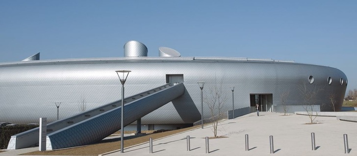 Nahezu jeder Badegast ist fasziniert, wenn er das erste Mal vor dem elliptischen Neubau des „Schwimmzentrums Les Thermes“ im luxemburgischen Strassen-Bertrange steht. Wie ein gigantischer Wassertropfen ruht das interkommunale Schwimmbad auf der grünen Wiese und bannt den Betrachter mit schierer Größe. Mit einer Grundfläche von 10000 m 2 bietet der Neubau bis zu 1200 Personen Platz. Stolze 5500 m 2 misst allein die aus Aluminiumschindeln bestehende Gebäudehülle, die wie ein schuppiger und zugleich elastischer Panzer wirkt. Hauteng schmiegt sich die silbergraue Metallfassade an die Kontur des Bauwerkes und prägt dessen Erscheinungsbild maßgeblich. Das 18 m hohe Dach des elliptischen Paraboloid verfügt über eine 4500 m 2 große und mit Photovoltaik-Modulen bestückte Folienabdichtung. Von der Dachfläche stammendes Niederschlagwasser dient zur Speisung des auf dem Gelände angelegten Seerosenteiches.