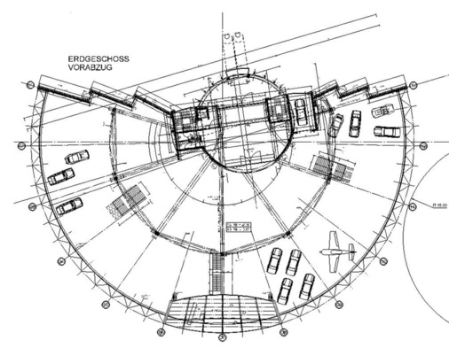 Auch das Prefalz-Aluminiumdach punktet mit zahlreichen durchdachten Details. Dabei überzeugt unter Anderem die gelungene Dacheinteilung. Wie riesige Tortenstücke verlaufen die konischen Scharen auf den außerhalb der Dachmitte angeordneten Drehturm zu. Etwa auf der Hälfte wird die insgesamt circa 33 m lange Dachfläche von einem 180 mm hohen Gefällesprung unterbrochen. Die Gefällestufe gewährleistet einerseits die sichere Ausdehnung der silbermetallic beschichteten Scharen. Andererseits sorgt die an der Stufe eingebaute Öffnung für eine konstante Belüftung der hölzernen Dachkonstruktion und ermöglicht gleichzeitig den einfachen Deckbreitenwechsel der Scharen. Unterhalb des Gefällesprungs beträgt die Deckbreite der über 18 m langen Prefalz-Scharen etwa 12 cm – traufseitig sind die Falze bis zu 60 cm voneinander entfernt.