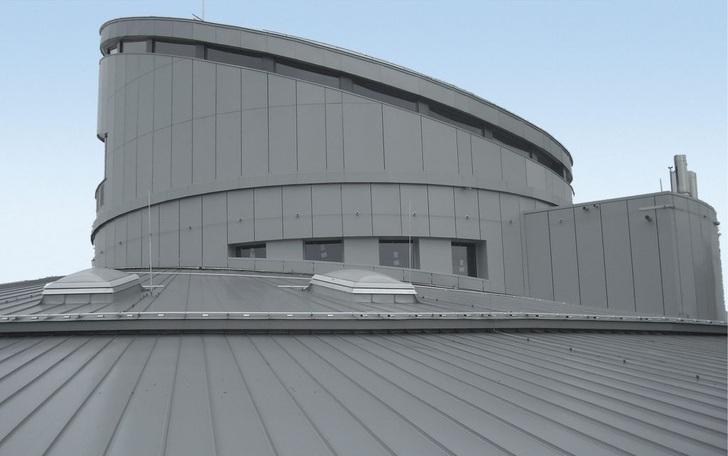 Auf einer Gesamtlänge von 7500 m profitieren die mit einem Dichtband versehenen Stehfalze vom sogenannten Clip-Relief. Das sich zunehmender Beliebtheit erfreuende Clip-Relief ist eine Weiterentwicklung des traditionellen Stehfalzes. An der Falzaufkantung sowie am unteren Auflagebereich der Schar sorgen sickenförmige Erhöhungen für zusätzliche Sicherheit sowie mechanische Entlastung. Die mit einer Schlebach-Profiliermaschine vom Typ Quadro vor Ort profilierten Clip-Relief-Profile minimieren nachweislich mögliche Knistergeräusche. Darüber hinaus verringert das Clip-Relief Reibungseffekte zwischen Schar und Hafte deutlich. Dies ist vor allem bei größeren Scharlängen vorteilhaft. Auch die 40° geneigte Dachscheibe des drehbaren Turmes ist mit Clip-Relief-Profilen eingedeckt. Entsprechende Stehfalz-Klemmverbinder garantieren den sicheren Halt der Photovoltaikanlage. Rundgebogene, dem Dachverlauf folgende Schneefangrohre sind ebenfalls mit Klemmverbindern fixiert. Außerdem gehört ein Safepoint-Sicherheitssystem zum Auftragsumfang.