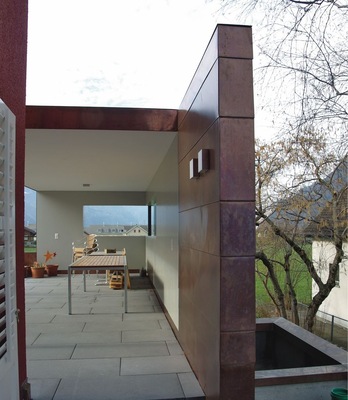 Im vergangenen Jahr erhielt die Bless AG aus dem schweizerischen Erstfeld den Auftrag, einen modernen kubischen Baukörper mit einer Kupferhülle zu versehen. Der Sicht- und Wetterschutz einer Gartenterrasse sollte eine Fassadenhülle erhalten. Mit dem Ziel, einen deutlichen Kontrast zur Bausubstanz der älteren Villa zu erzeugen, forderten Auftraggeber und Architekt den Verzicht auf jegliche Überstände an Profilen wie Fensterbänken und Flachdachanschlüssen. Um diese Wünsche umzusetzen, bot sich eine Großrautenbekleidung mit individuell gewählten Achsmaßen und Baubreiten als beste Lösung an. Doch selbst innerhalb der Wandfläche galt es, Materialaufdopplungen, etwa durch überstehende Falzverbindungen, zu vermeiden. Die Anforderung an die Fassadenbekleidung, eine flächenbündige Stoßausführung der Fassadenelemente zu erreichen, führte dazu, dass sämtliche Längs- und Querfalze nach hinten abgesetzt wurden. Hinzu kam die arbeitsaufwendige Herstellung entsprechender Aussparungen in der Holzunterkonstruktion, um die abgesetzten Falze flächenbündig aufzunehmen.