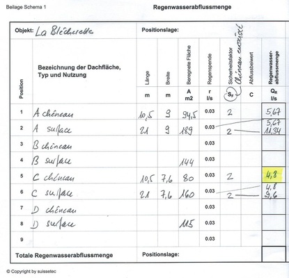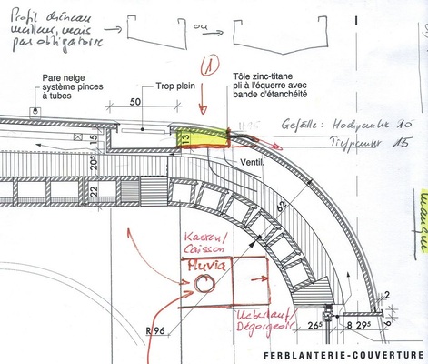 Die Dimensionierung und Gestaltung der vertieften Kasten-Rinne forderte die Kollegen aus Lausanne besonders. Der Knackpunkt dabei war die Erarbeitung eines optisch ansprechenden Details, das trotz geringem Gefälle und begrenzter Tiefe funktioniert. Die Rinne, einschließlich der Entwässerungspunkte, wurde über der Wölbung und vor Beginn des Satteldaches am Dachrand platziert. Zur Berechnung fand die neue Suissetec-Entwässerungsnorm Anwendung. Dabei wurden die Dachfläche, die Rinnenlänge einschließlich der Abläufe und die Größe der Notüberläufe am Rinnenboden berücksichtigt. Zur Ausführung kam ein Unterdruck-Dachentwässerungs-System mit einem Innenrohr-Durchmesser von 90 mm,bei einer Rinne mit Höhe von 154 mm am Tiefpunkt (Staudruck) sowie Rinnen-Querschnitt von 770 cm². Die notwendige Druckhöhe erforderte zudem eine Optimierung der Holz-Unterkonstruktion, wodurch die Querlüftung von der Wand zum Dach auf den Mindestquerschnitt von 30 mm reduziert wurde. Diese Maßnahme war auch deshalb wichtig, weil die Entwässerungsrohre dadurch in der Belüftungsebene versteckt werden konnten. Sollte trotz der Berechnungen die Rinne einmal versagen, wird überlaufendes Regenwasser aus der Rinne auf das Unterdach und damit zur Belüftungsöffnung der unteren Rundung geleitet.